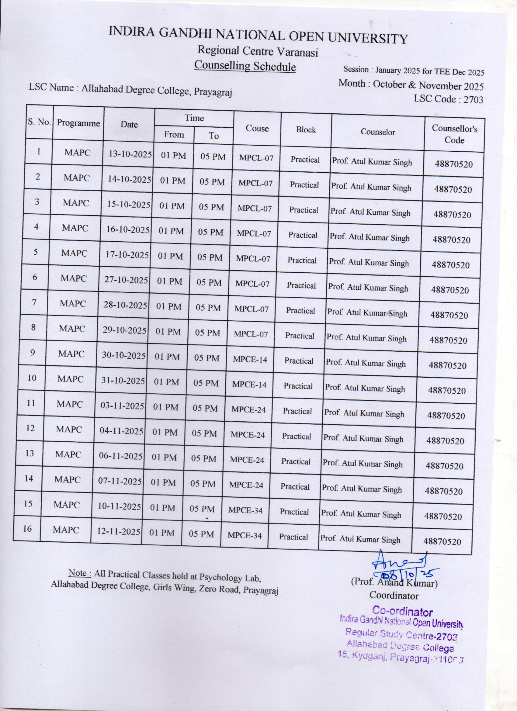 Offline counselling schedule of MAPC 2nd year (Starting from 01.09.2025)