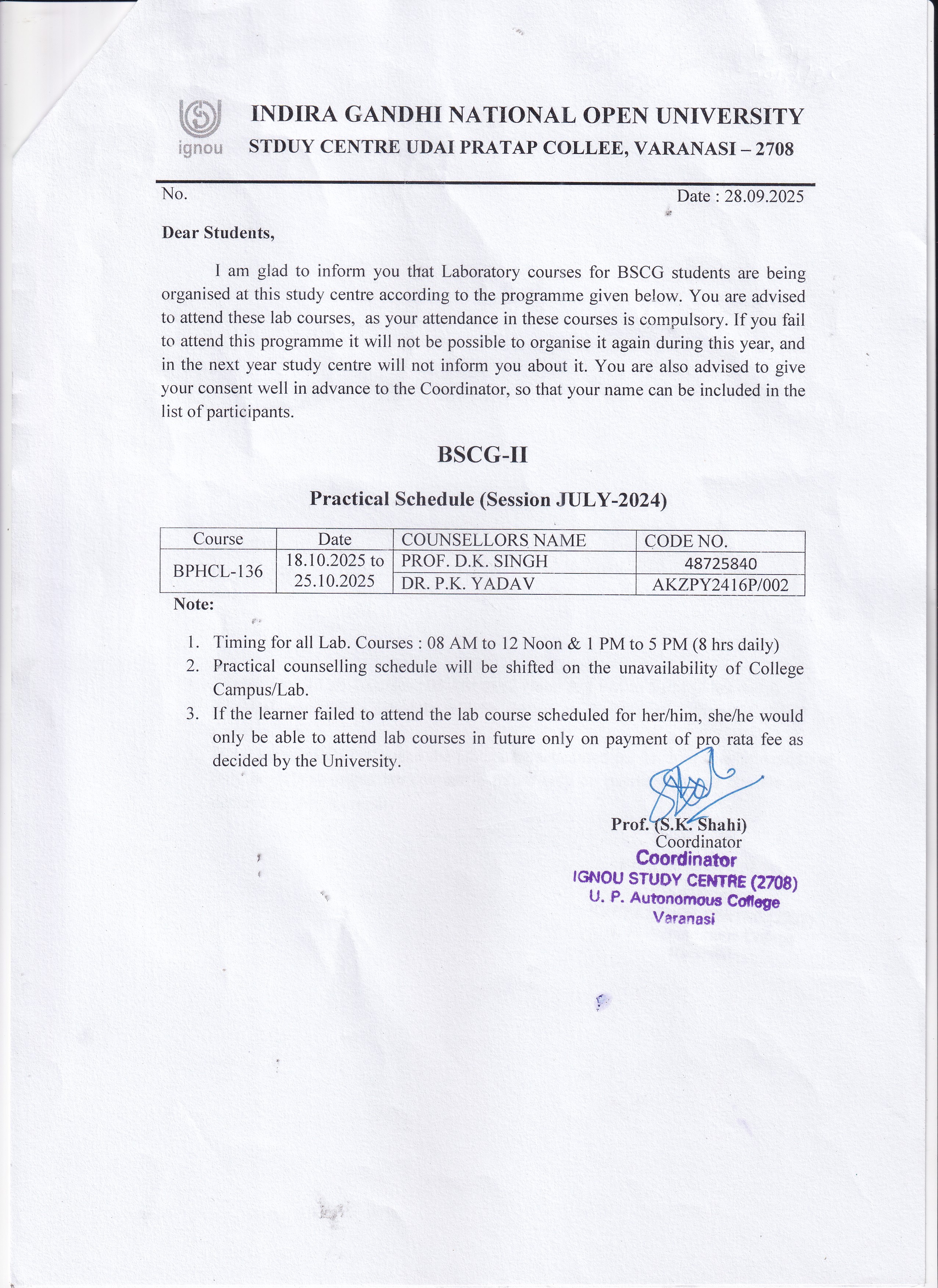 2708 (U P College, Varanasi) : Counselling Schedule of