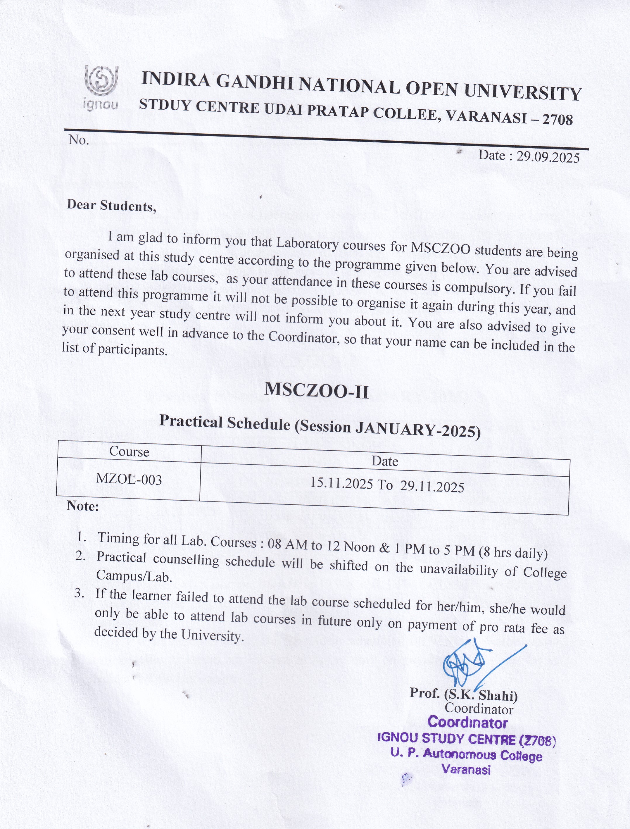 MSc (Zoology) (MZOL 03) practical counseling schedule (starting from 15.11.2025)