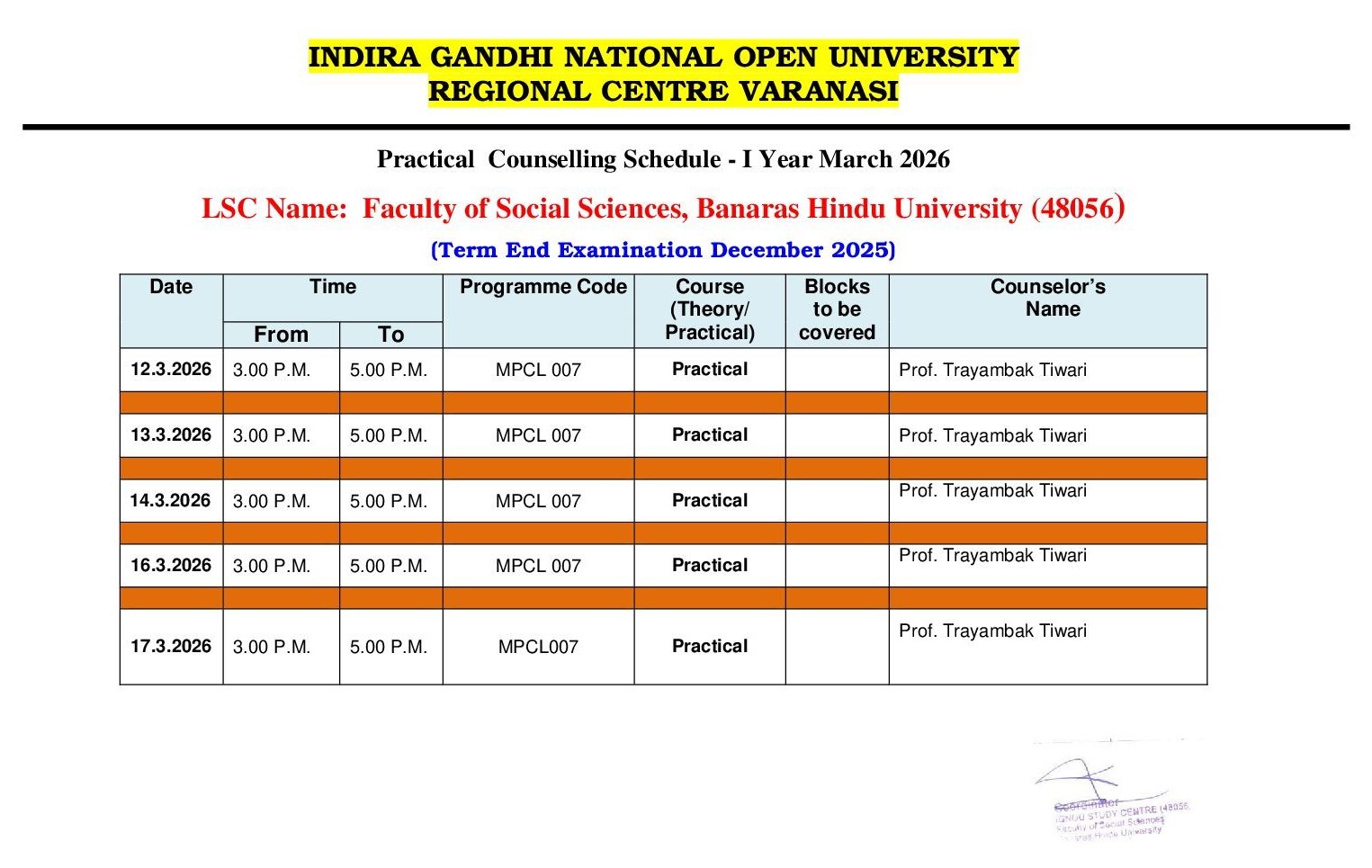 Practical counselling schedule of MPCL-07 (MAPC) (Starting from 12.03.2026)