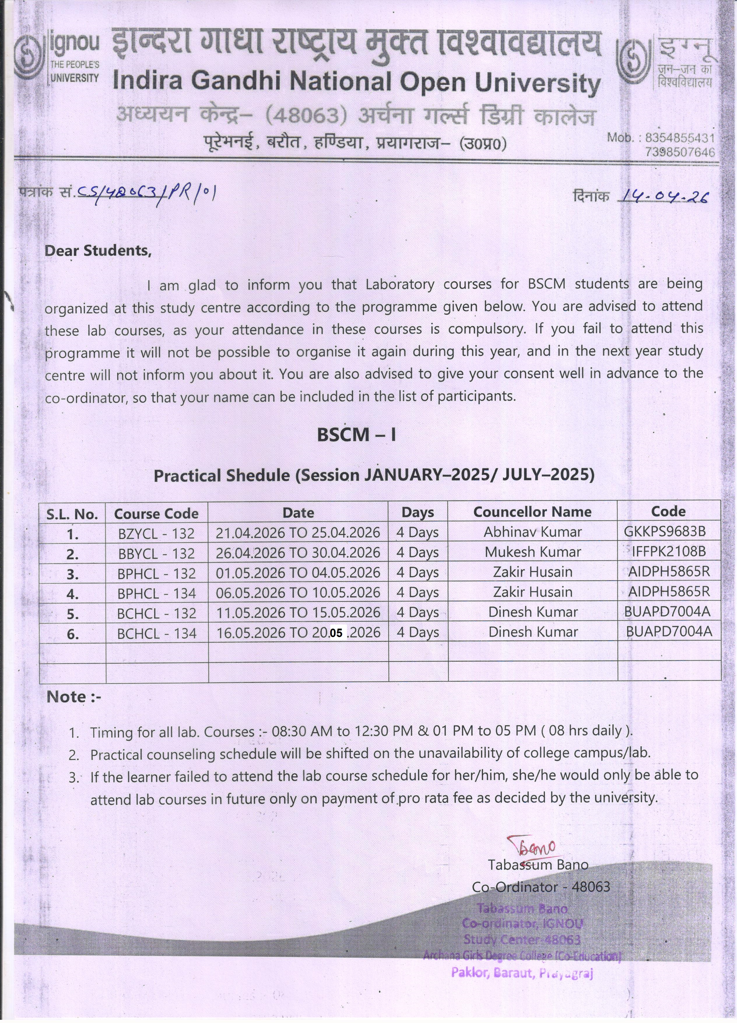 BSC practical conselling schedule (BGYCL-134 & BBYEL-142) (Starting from 07.05.2026)