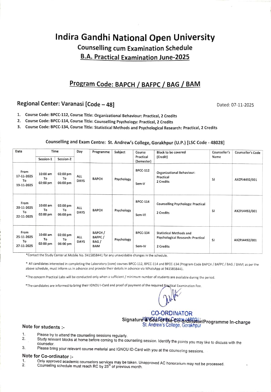 BA/BAM/BAFPC/BAPCH (Psychology courses) Practical Examination Schedule (June 2025 TEE) of SC-48028 (Starting from 17.11.2025)
