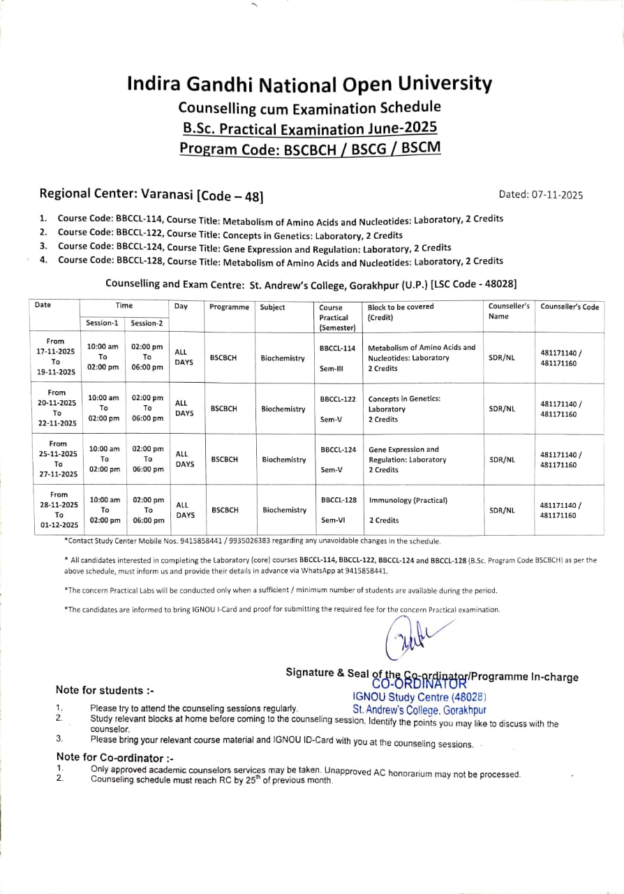 BSC(Biochemistry) Counselling and Practical Examination Schedule (June 2025 TEE) of SC-48028 (Starting from 17.11.2025)