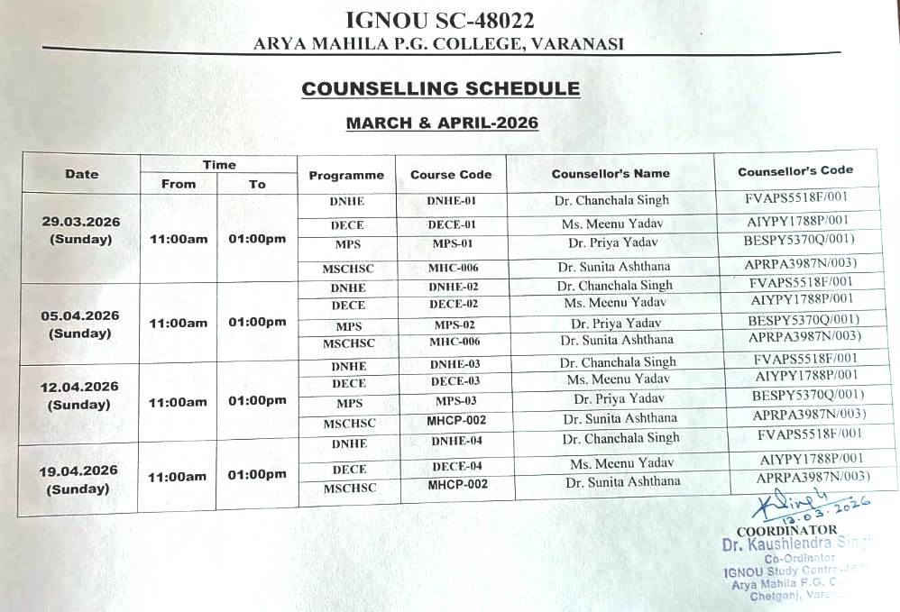 Counselling Schedule of DNHE,DECE,MSCHSC & MPS programme (Starting from 29.03.2026)
