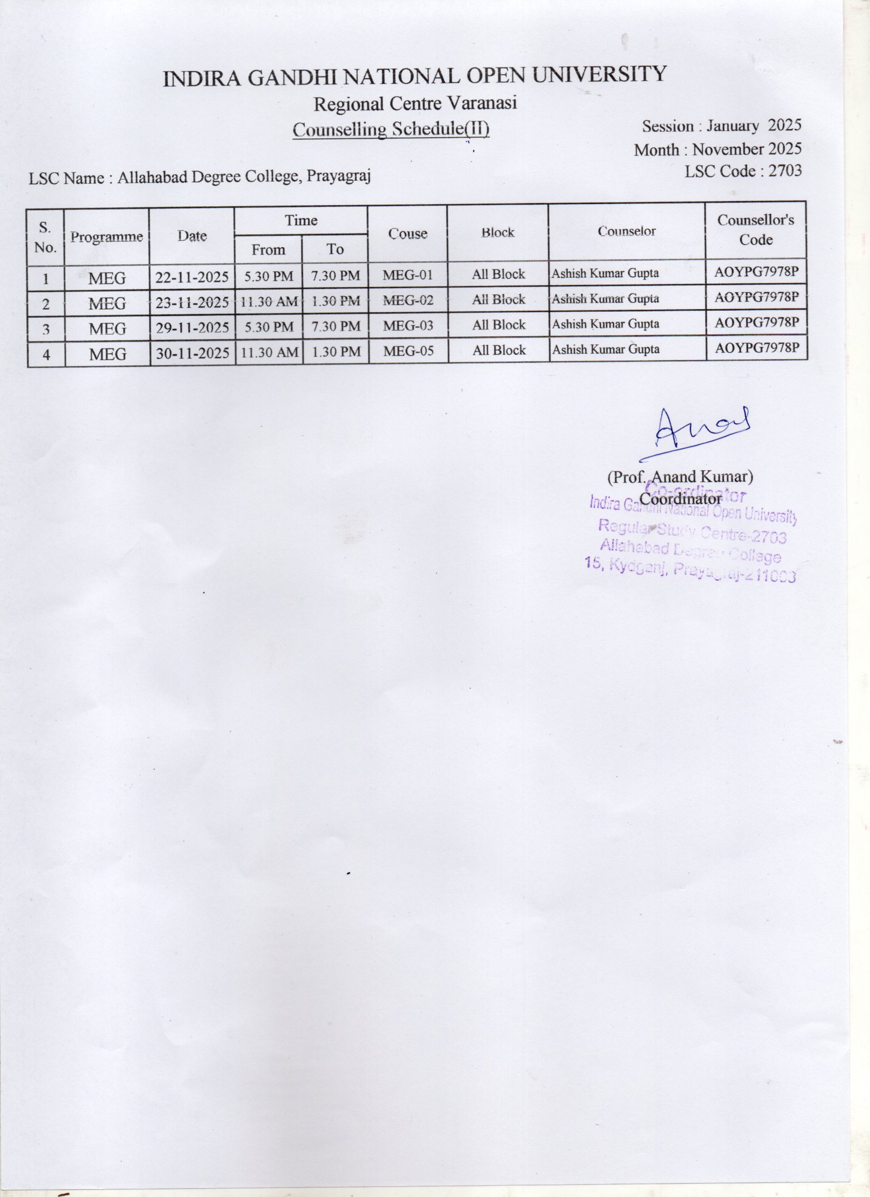 MEG Counselling Schedule (Starting from 22.11.2025)